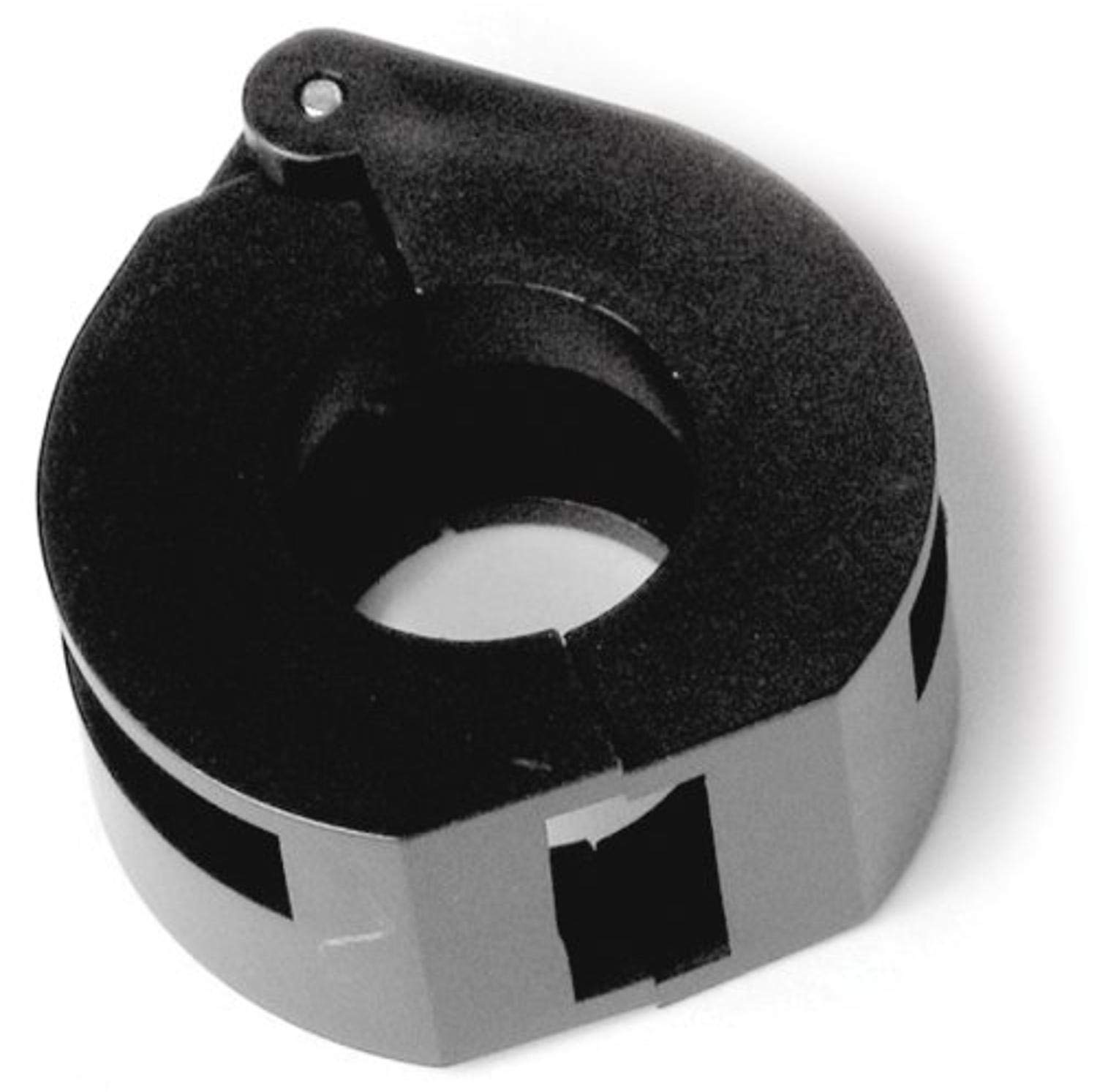 Image: The Performance Tool W83110 Heater Hose Disconnect Tool. This image shows the black, circular tool with a hinged lever on top, designed to fit around automotive lines for disconnection.