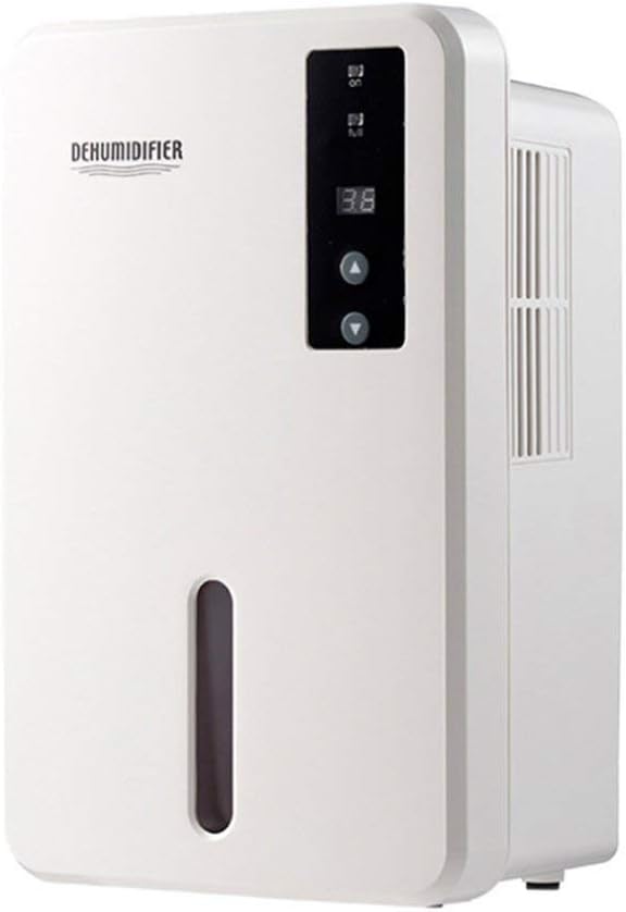 The dehumidifier has a 1.5-liter water tank capacity and features automatic shut-off when the tank is full, indicated by a float sensor. It also includes over-temperature protection.