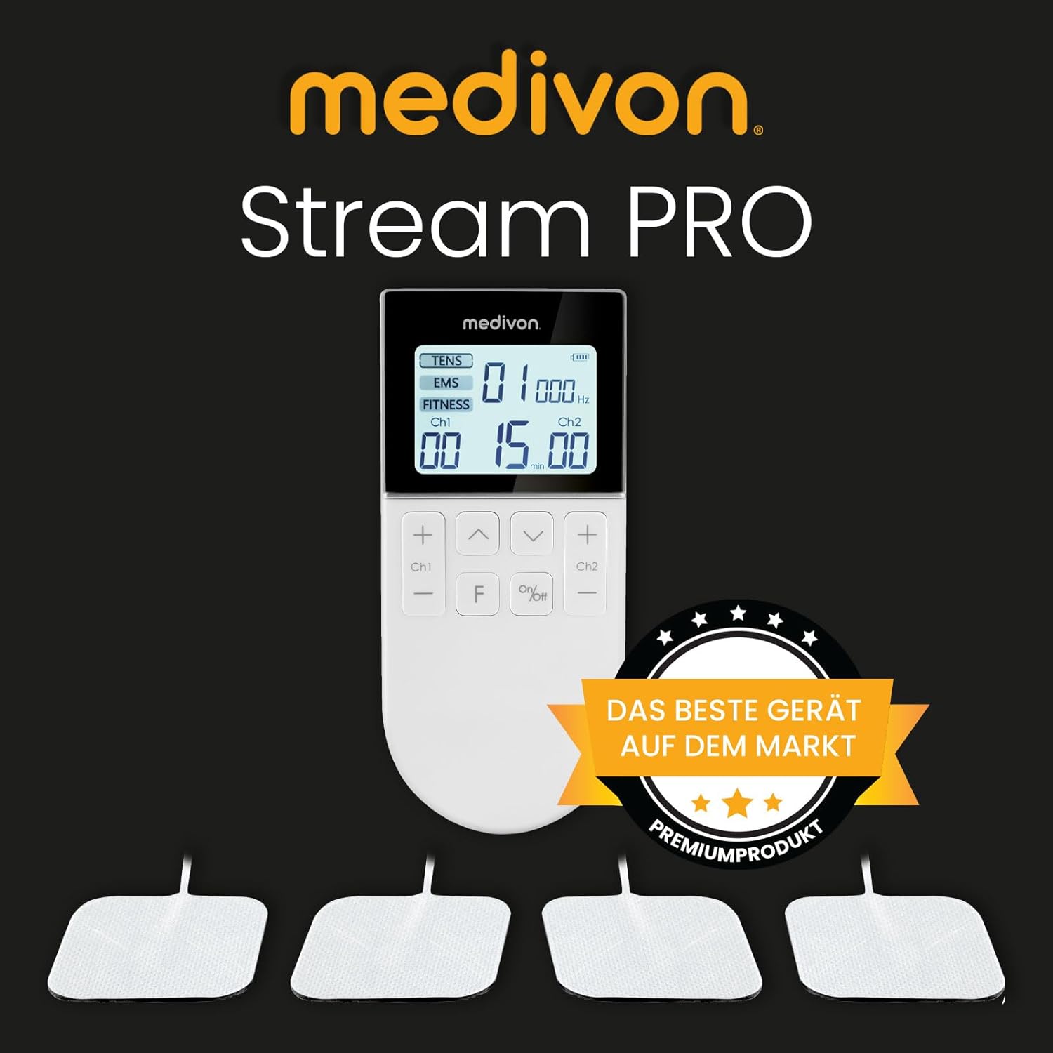 The Medivon Stream PRO is a compact and professional electro stimulator featuring an LCD display for easy program selection and intensity adjustment. It offers TENS, EMS, and Fitness modes with multiple intensity levels.
