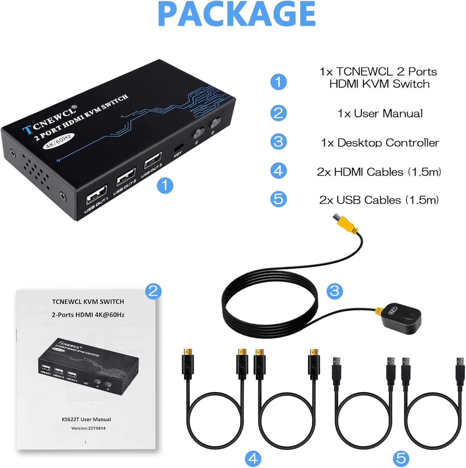 Image: The package contents include the KVM switch unit, user manual, desktop controller, two HDMI cables, and two USB cables.