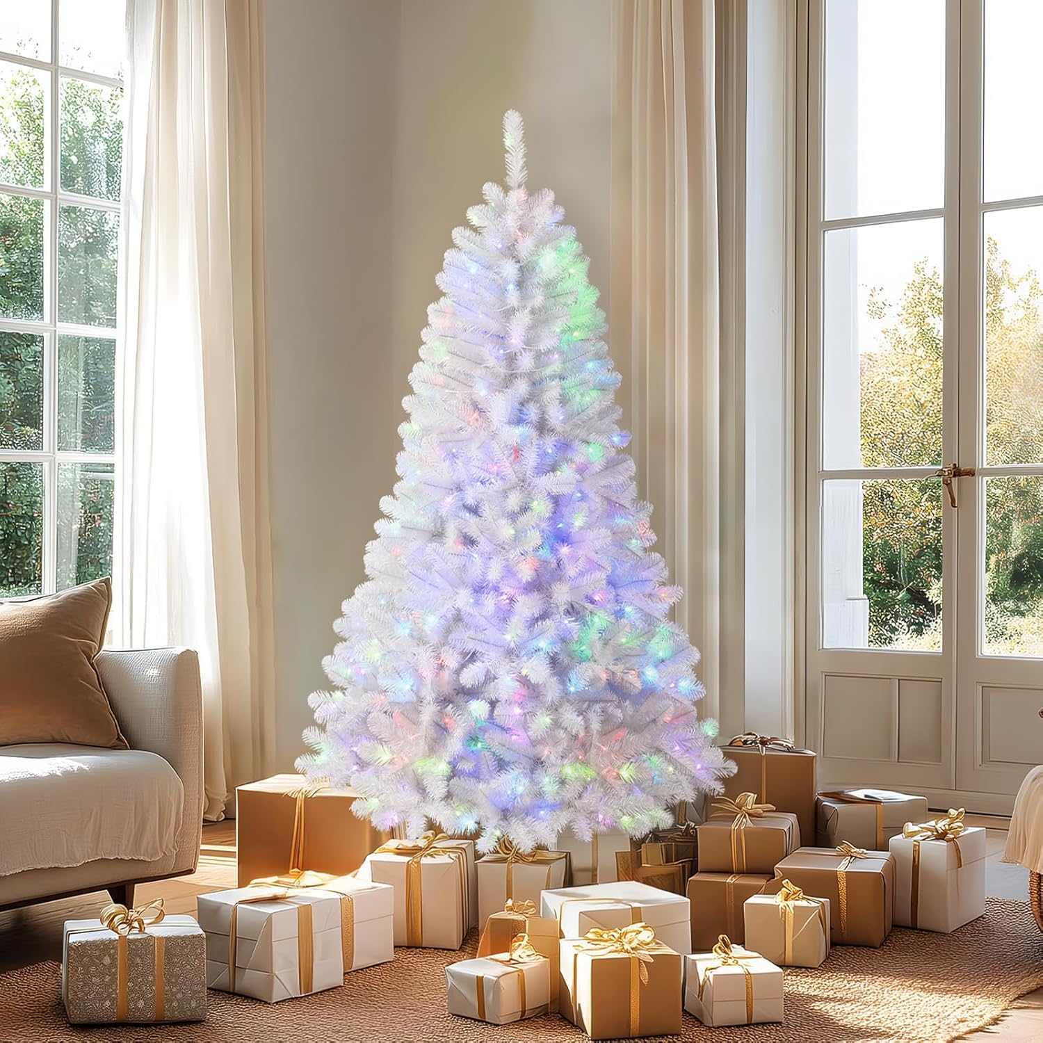 This close-up image highlights the life-like PVC branch tips and the integrated RGB lights, emphasizing the pre-lit design.