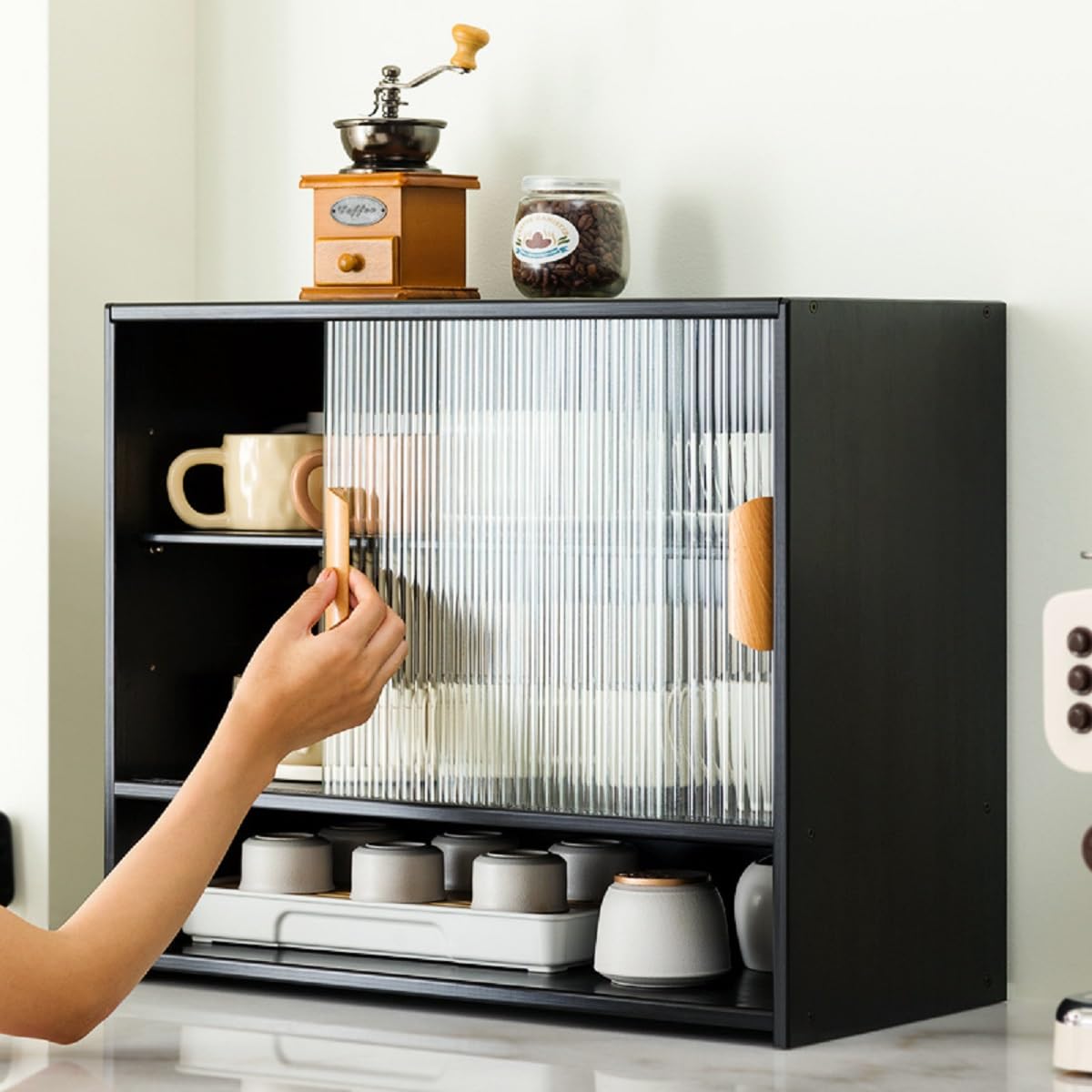 Image: The Gdrasuya10 2-Tier Countertop Cabinet, showcasing its compact design and sliding glass doors.